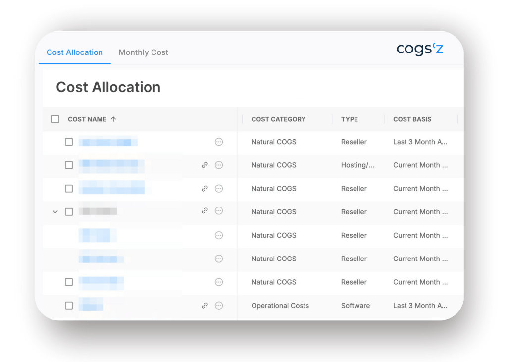 - There are three types of data necessary to drive the most insightful data from Cogs’z. The first is customer revenue by month by product sku. This will tell the system what products are producing the revenue. Next is a list of costs or expenses by month incurred by the business to directly or indirectly support its products and customers. This is usually COGS and other related expenses like CSMs, Account Management, Sales and Marketing. Cogs’z can also handle any overhead expense used to support the business used to understand contribution margin by customer and product. Lastly, Cogs’z can handle any key business drivers used to accurately allocate expenses to customer and products. These could include support tickets, user counts, calls, shipments, payments, or any kind of transaction. With the above data, Cogs’z can show you opportunities to drive growth and improve profitability.