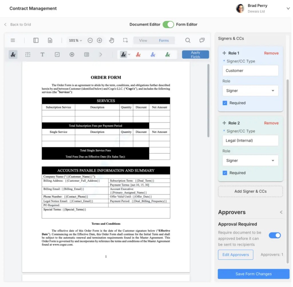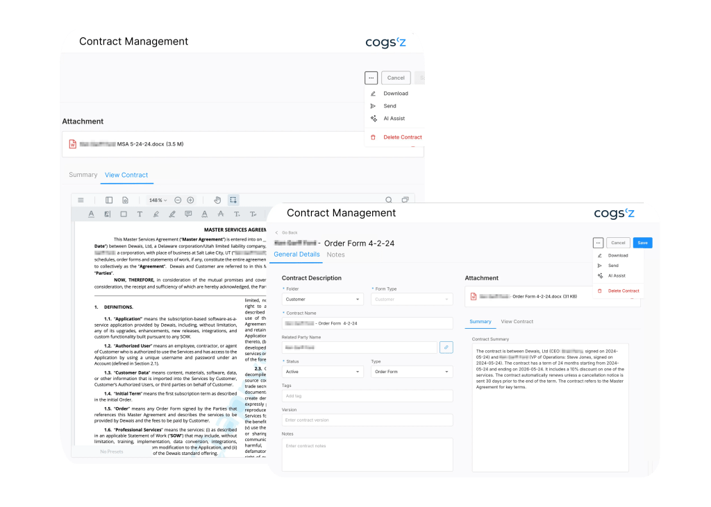 Prepare, review, and send for approval customer quotes, sales agreements, NDA’s, MSA’s, and more in minutes with Cogs’z eContracting.